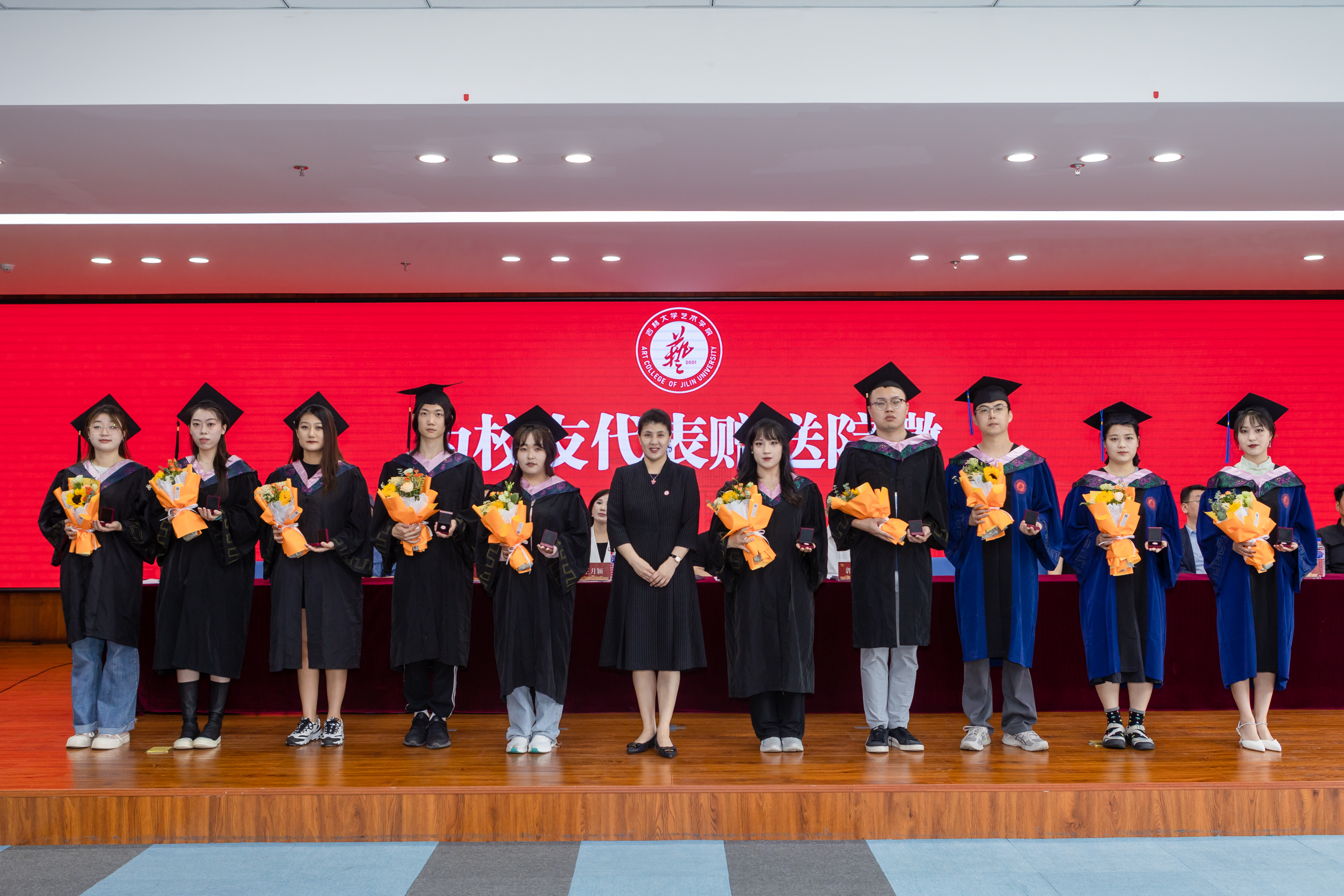 设计系、美术系、音乐系近30位导师作为主礼教授见证毕业生授予学位。仪式最后,主礼教授全体起立,一同祝福毕业生们毕业快乐,并深情寄语,希望同学们始终高扬理想信念旗帜,向下扎根,向上生长,以“求实创新,励志图强”的实际行动践行初心使命,在新时代的奋斗中释放青春激情、追逐青春理想,脚踏实地、苦练本领,用自己的双手创造属于自己的精彩人生。与会师生共同高喊“一日归属吉大,一生念念不忘”表达对老师的感恩,对母校的眷恋和对未来的信心。
