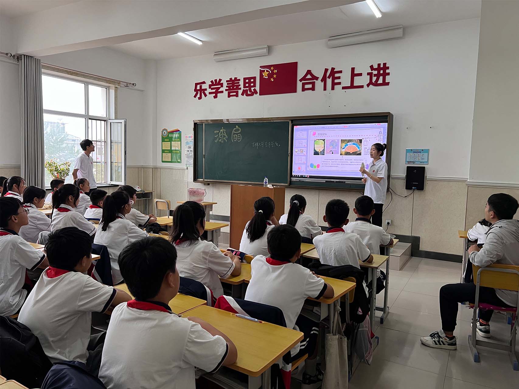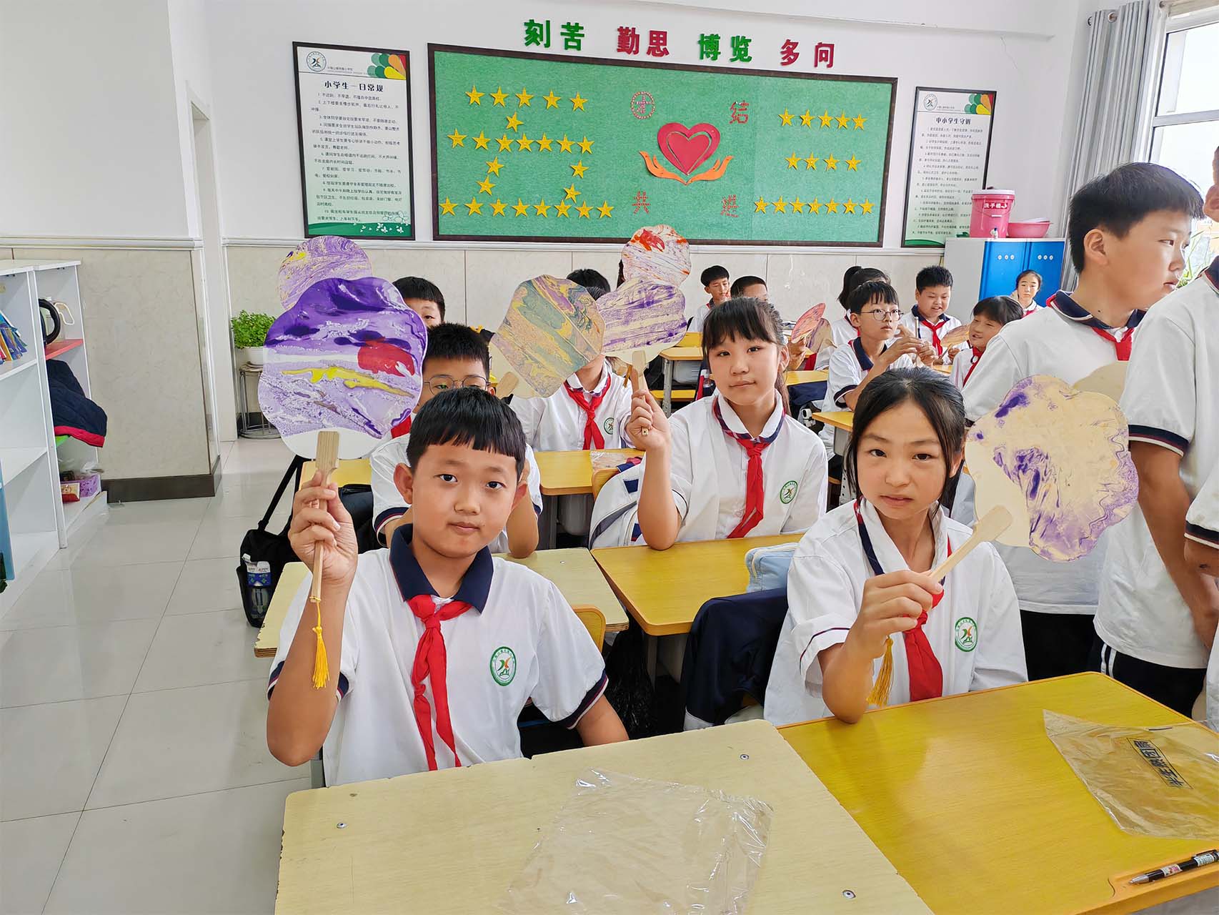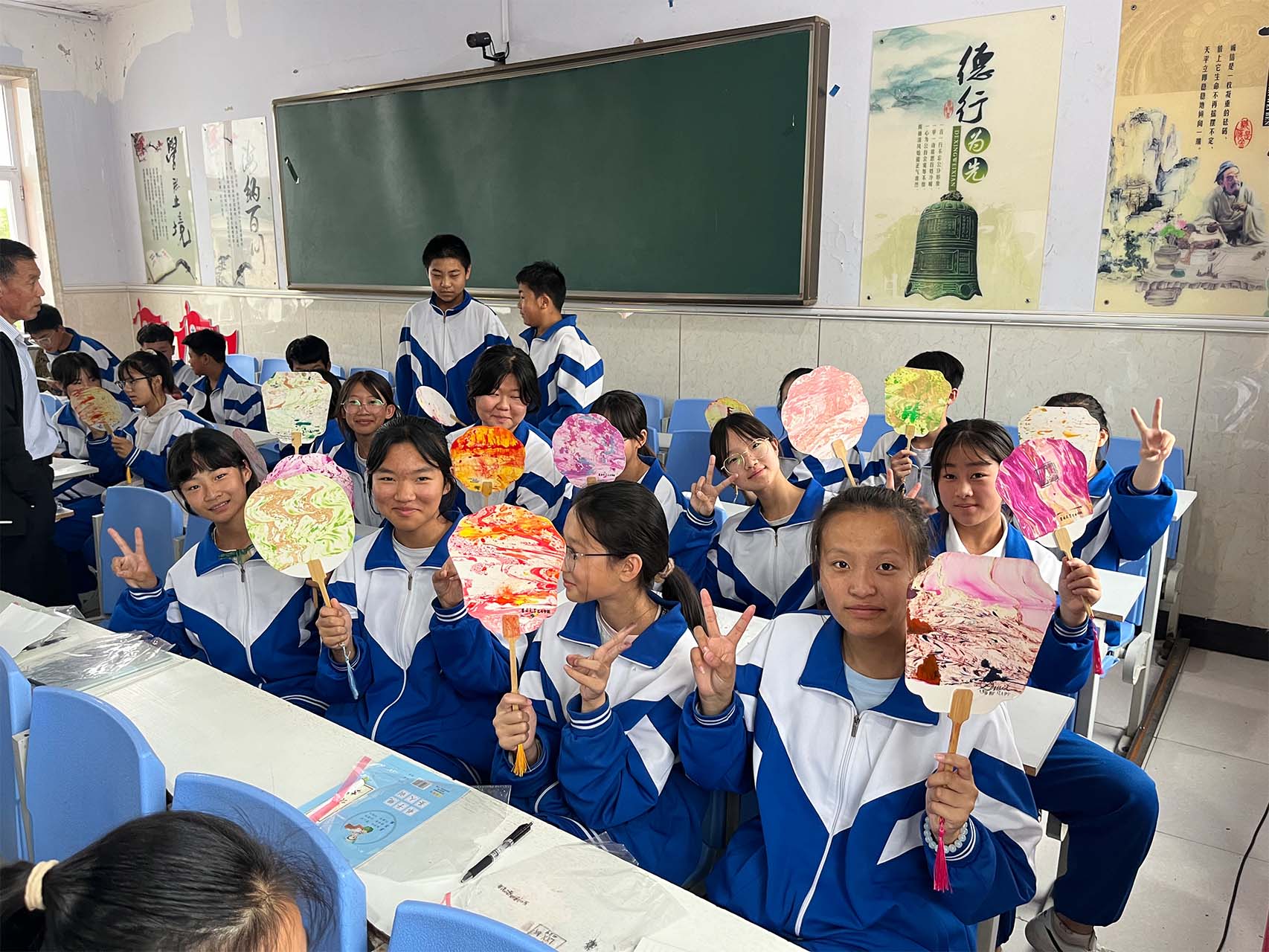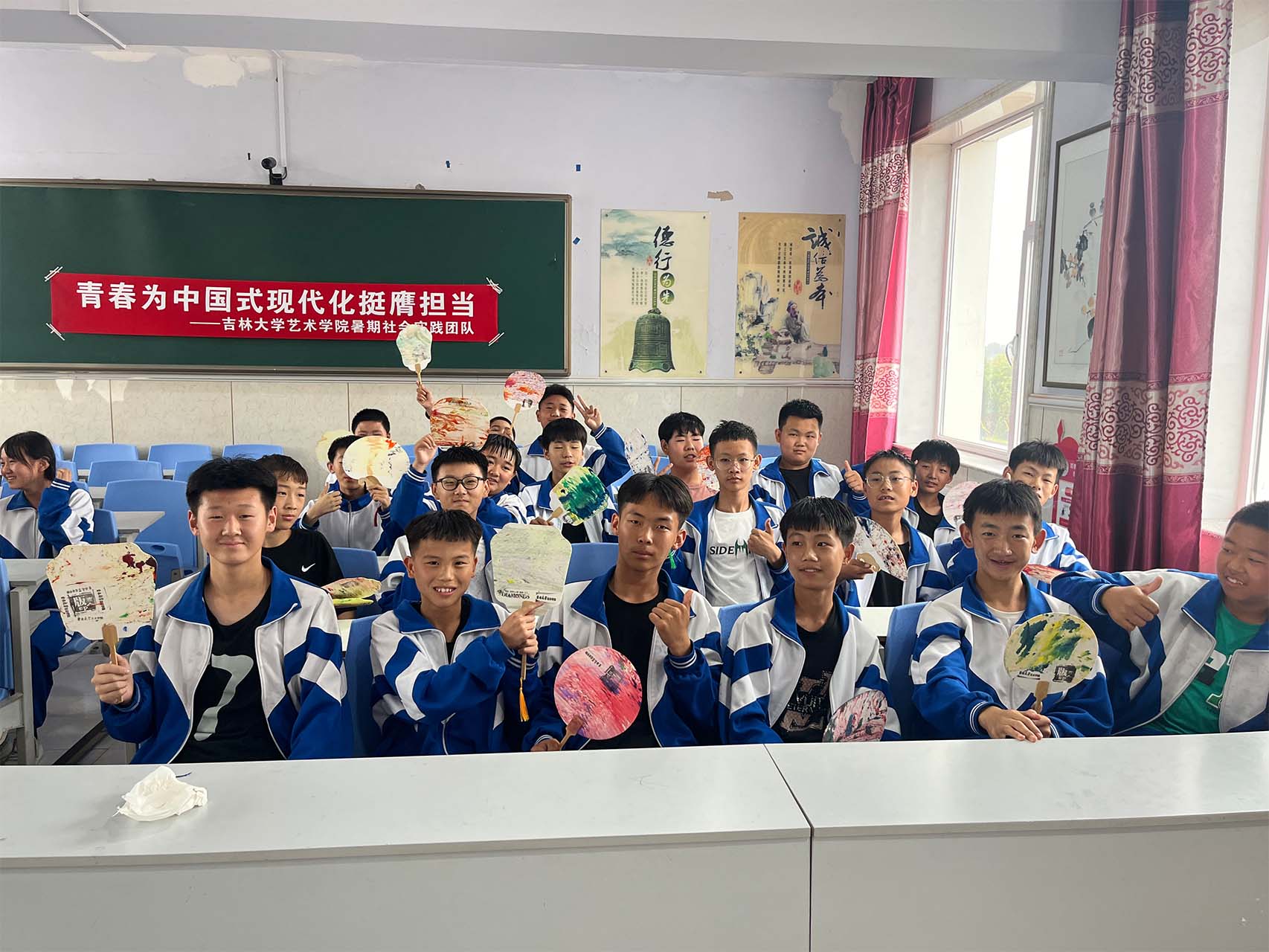 与此同时,由程然、徐子怡、智暄航、肖林林组成的小学美术组,杨晨昕、曲卓盛、石代宁、周正组成的小学音乐组前往通榆县兴隆山小学开展实践活动。活动伊始,音乐实践志愿者向同学们系统讲授了音符与音乐相关知识,学生们认真听讲,学习了音高、音长等音符的基础知识,并进行简单的集体合唱。现场气氛热烈,同学们亲身体会到了音乐的韵律与情感,在实践中感受到音乐魅力。随后,志愿者指导当地同学进行漆扇制作。鼓励同学们充分发挥创意,通过试色、调色等多个步骤,同学们都成功创作出极具个性化的、独一无二的漆扇作品,体会了到传统工艺的艺术魅力。
