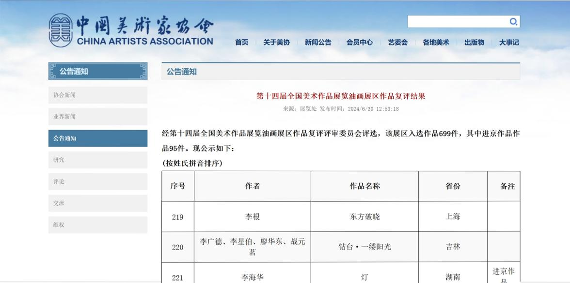 近日,中国美术家协会官网公布了第十四届全国美术作品展览作品复评的结果。Javbooks