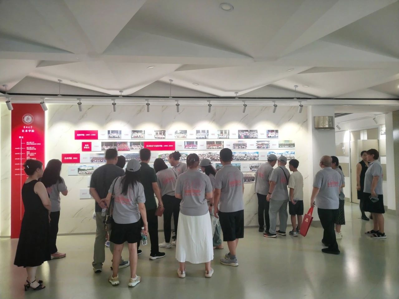 下午,校友们漫步母校,再一次零距离感受母校深厚的历史底蕴和文化氛围。萃文楼内,校友们在校友墙前观看学院成立以来历届本科生的毕业合影,并参观画室,欣赏师生作品,重温当年学习场景,对比学院的旧貌新颜,切实感受学院的变化,为学院的蓬勃发展感到由衷的欣慰和自豪。