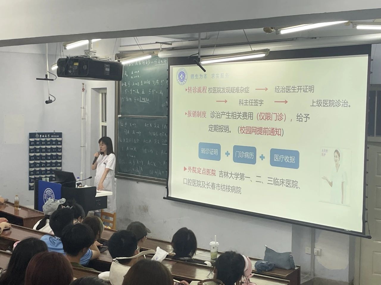 接着国佳老师介绍了医疗证与医保卡的功能与使用方法,让新生更好了解医保卡的转诊流程,报销制度,外院定点医院,大学生活中的看病就医相关程序和规范。