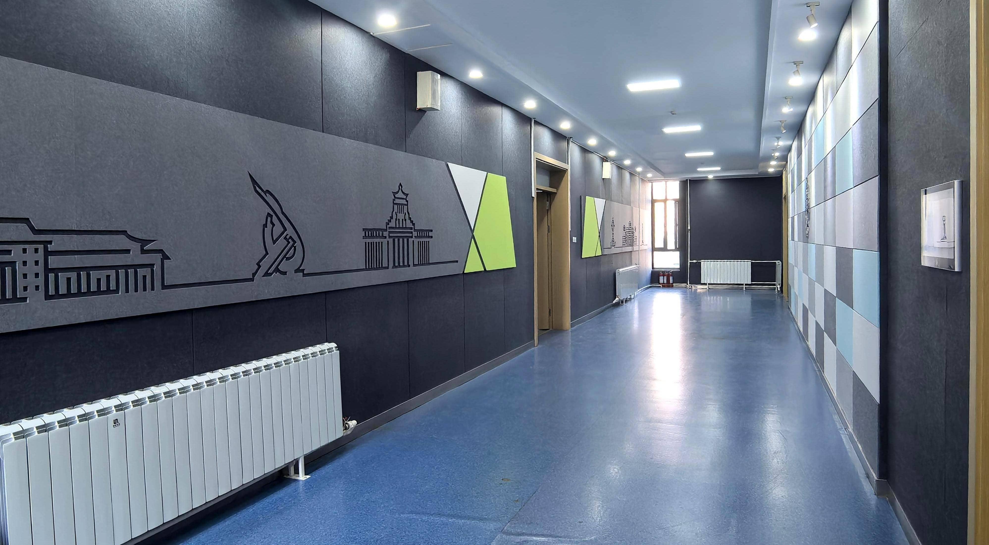 在本科生院及东区办公室的指导下,接到南岭校区逸夫教学楼走廊改造专项工作,设计系迅速组建由师生组成的实践教学团队,高效完成此次改造任务。经过前期多次现场勘察、开会讨论设计方案后,在72小时内完成包括:电梯间形象墙、走廊文化角、会议厅走廊空间三处改造项目的视觉设计方案。通过采用定制环保材料进行现场拼装的方式,既能保证艺术品质又能缩短工期。自9月19日起,实践教学团队与施工方开启“白+黑”工作模式。连续6昼夜完成近300平米墙面的艺术处理和多组装饰灯箱的安装调试。9月25日,南岭校区逸夫教学楼走廊文化建设改造项目全面竣工,焕然一新的走廊空间成为校园美育教学实践与学科精神传承的创新载体。