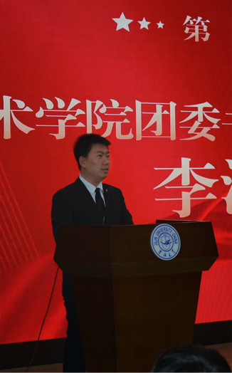 第一次全体会议在嘹亮的《中华人民共和国国歌》旋律中拉开序幕。第一项内容由学院团委负责人李洋老师讲话。学院团委始终坚持以习近平新时代中国特色社会主义思想为指导,围绕学院党政工作中心和上级团组织工作重点开展工作,并在学院师生的共同努力下,获得了“2023年度先进基层团委”称号,培养了一批认真负责的团学干部。希望换届的新同学能够围绕中心、服务大局,在团学组织中、在服务同学时,真正提升自己综合能力素质,为学院的繁荣发展添砖加瓦,向辉煌未来携手共进。