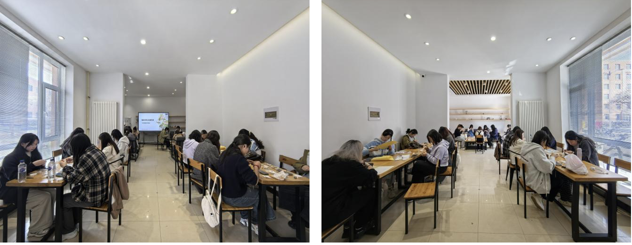 “以丝为墨,绕指成画”缠花活动在历史回响与现代创意的交织中徐徐展开。主持人为大家讲解了缠花技艺的文化渊源,志愿者为大家分发制作材料,并进行了“劈线、缠丝”等核心技法的讲解。同学们4人一组完成了造型固定、分层缠绕、细节修饰等实践制作环节,最终完成的作品中既有遵循古法的“鲜花”系列,也有包含创新思维的月兔胸针。
