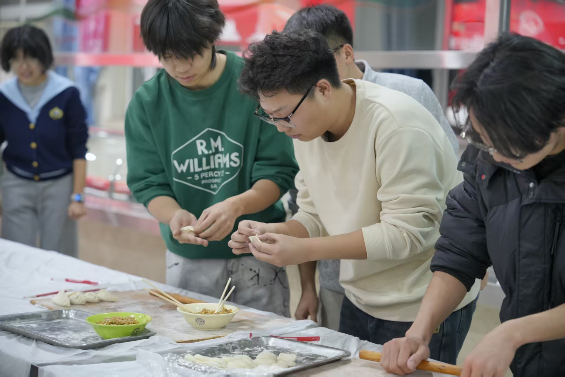 活动伊始,主持人介绍冬至节气内涵及“冬至大如年”的传统认知,讲解北方冬至吃饺子的民俗寓意,专业师傅现场示范和面、擀皮、包馅、收口等技艺,为师生实操提供细致指导。