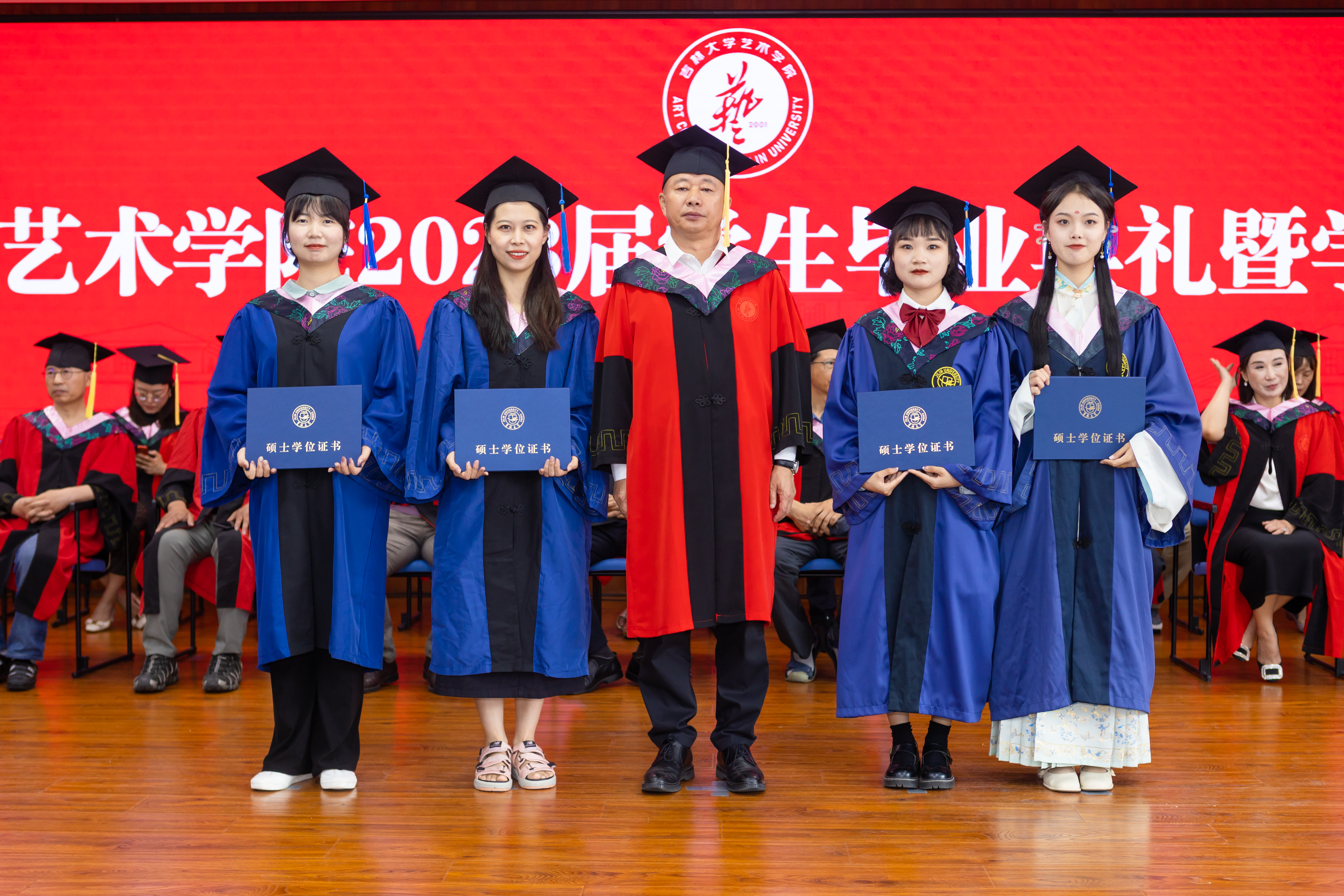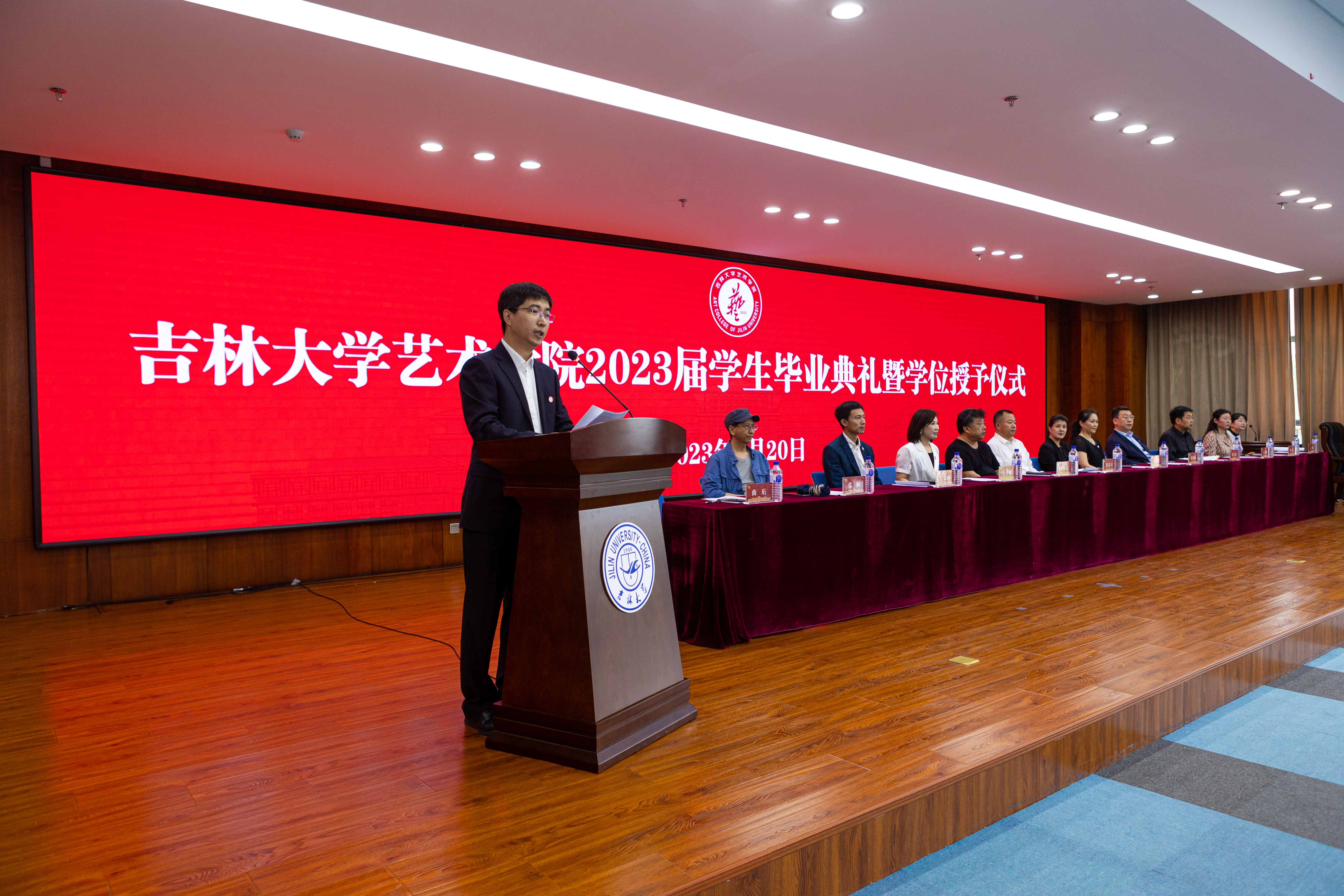 设计系、美术系、音乐系近30位导师作为主礼教授见证毕业生授予学位。仪式最后,主礼教授全体起立,一同祝福毕业生们毕业快乐,并深情寄语,希望同学们始终高扬理想信念旗帜,向下扎根,向上生长,以“求实创新,励志图强”的实际行动践行初心使命,在新时代的奋斗中释放青春激情、追逐青春理想,脚踏实地、苦练本领,用自己的双手创造属于自己的精彩人生。与会师生共同高喊“一日归属吉大,一生念念不忘”表达对老师的感恩,对母校的眷恋和对未来的信心。