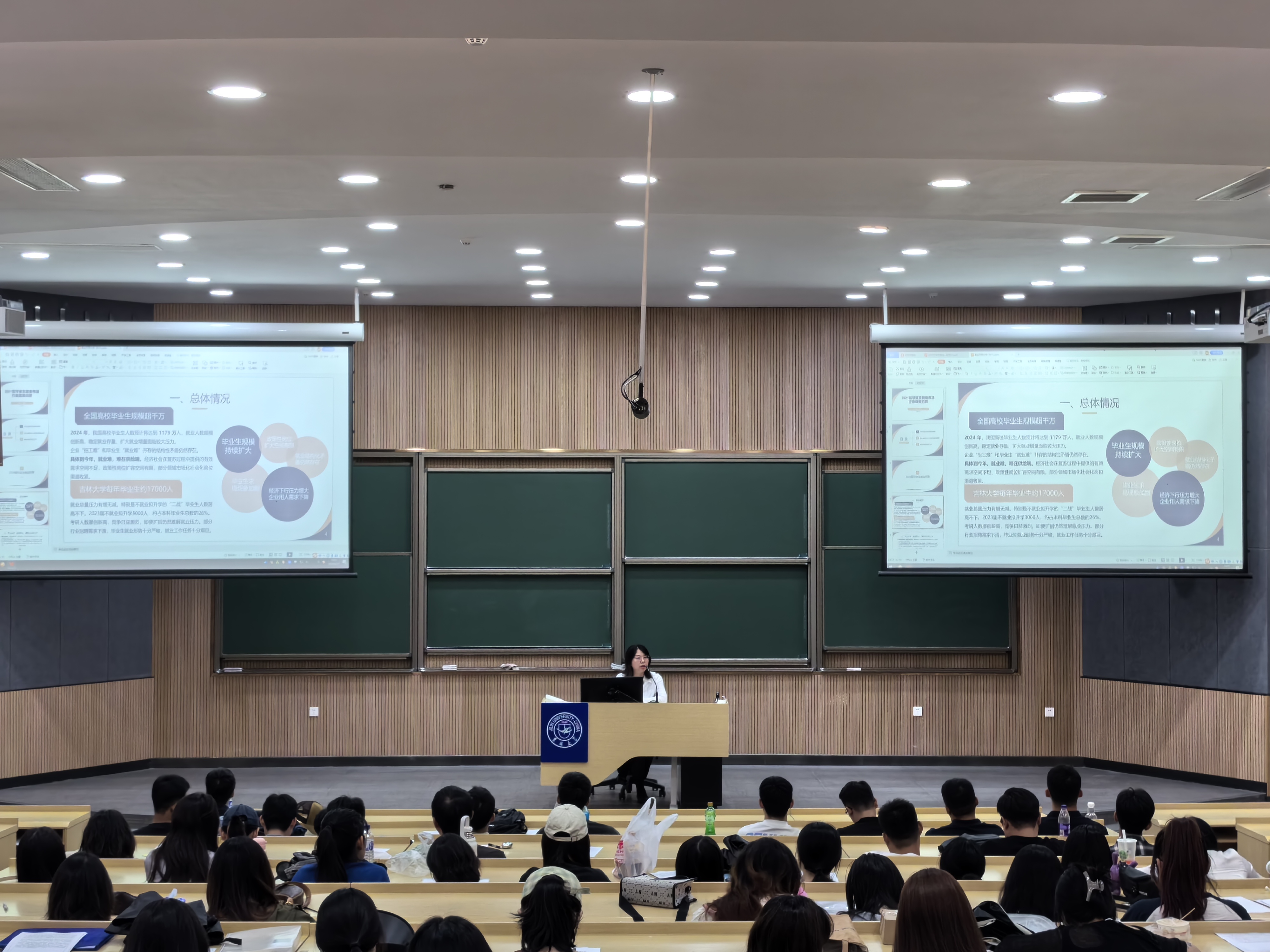 随后,冯彦杰书记针对目前我国就业形势,结合当前社会经济发展的实际情况,从2024届毕业生就业形势、用人单位对人才能力基本需求、就业前期准备工作三个部分,针对毕业生们即将面临的就业挑战和机遇进行了深入剖析。她强调,党和国家高度重视青年就业问题,出台了一系列政策措施鼓励支持青年就业创业,希望同学们能够树立正确的就业观和择业观,明确自我认知与定位,积极参加相关培训和实习,合理规划找工作流程,积极适应时代需求,不断提升自身综合素质和竞争力。