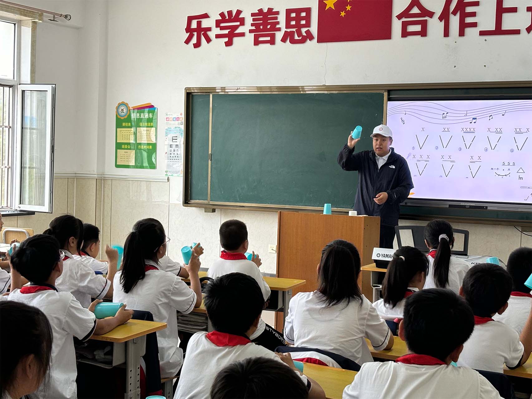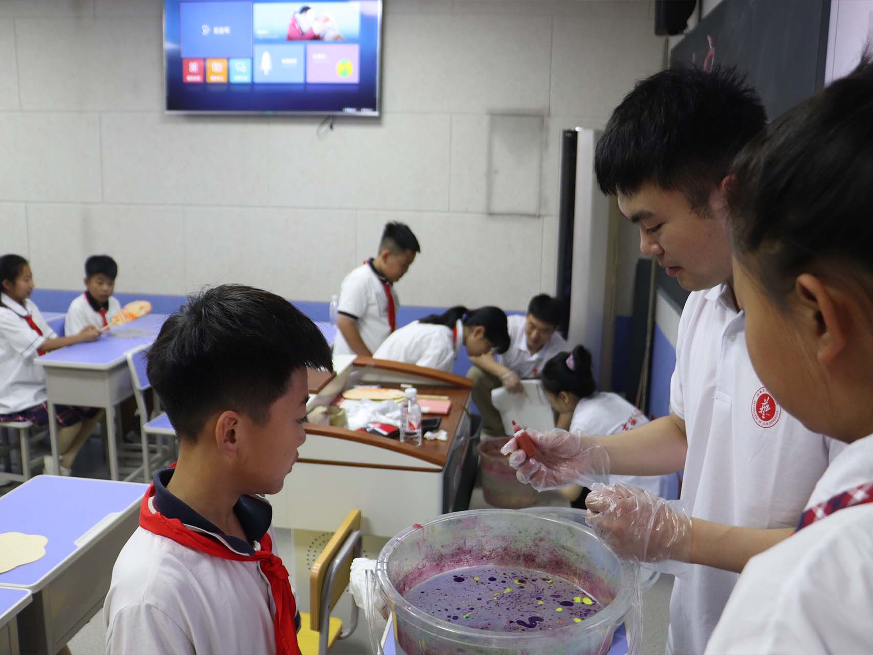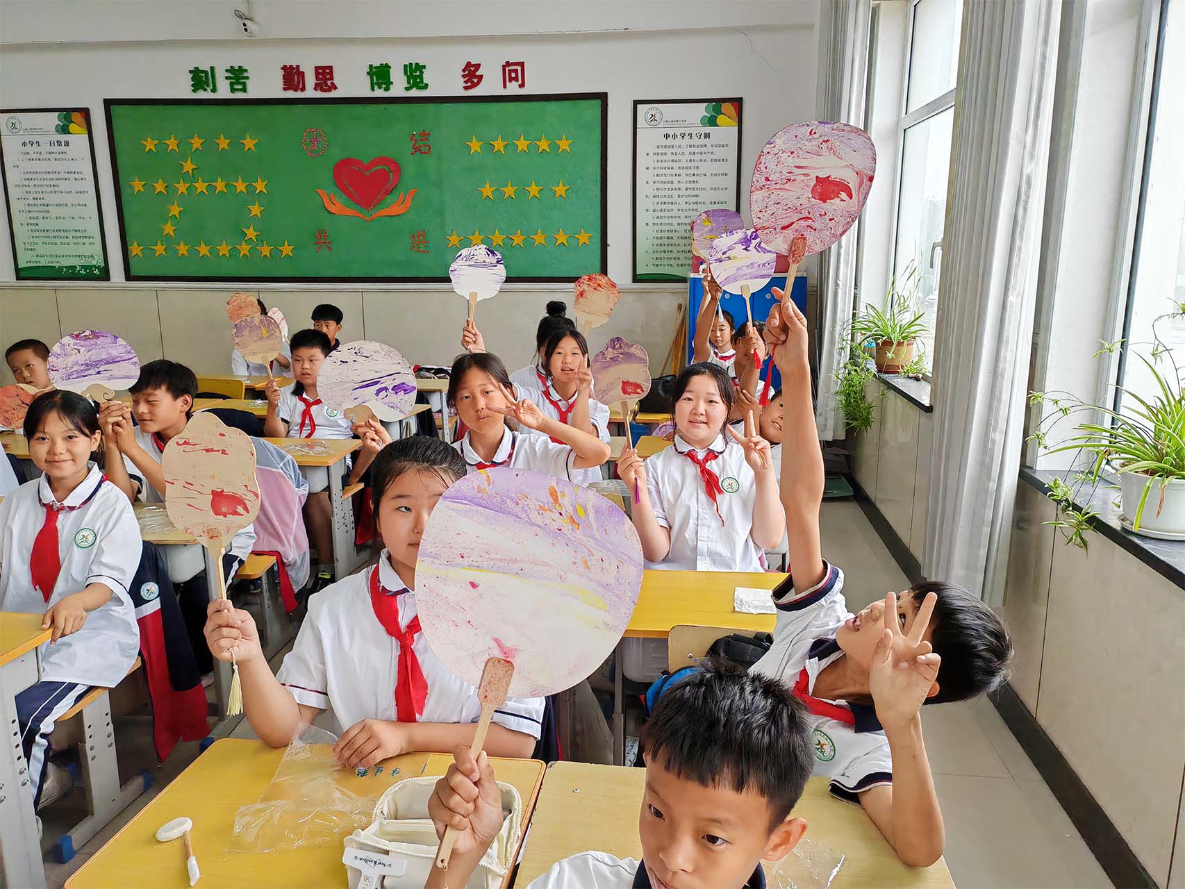 与此同时,由程然、徐子怡、智暄航、肖林林组成的小学美术组,杨晨昕、曲卓盛、石代宁、周正组成的小学音乐组前往通榆县兴隆山小学开展实践活动。活动伊始,音乐实践志愿者向同学们系统讲授了音符与音乐相关知识,学生们认真听讲,学习了音高、音长等音符的基础知识,并进行简单的集体合唱。现场气氛热烈,同学们亲身体会到了音乐的韵律与情感,在实践中感受到音乐魅力。随后,志愿者指导当地同学进行漆扇制作。鼓励同学们充分发挥创意,通过试色、调色等多个步骤,同学们都成功创作出极具个性化的、独一无二的漆扇作品,体会了到传统工艺的艺术魅力。
