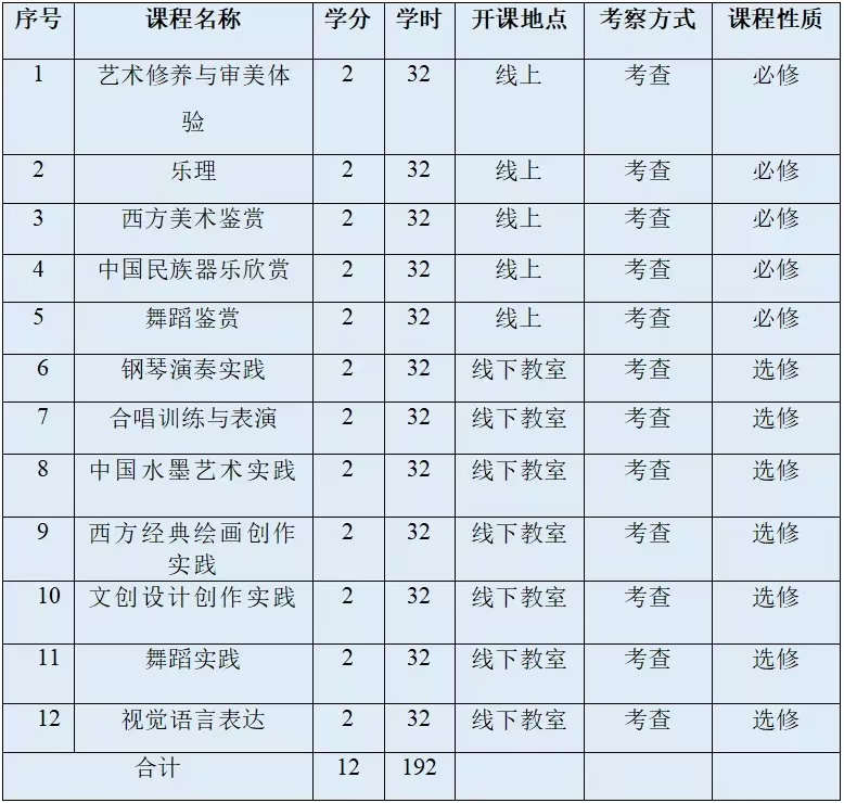 培养方式:采用线上线下融合式课程,每位学员修6门。其中线上设定必修核心课程5门、线下开设选修课程7门(任选1门),小班授课, 微专业实行小班化、个性化培养。注重艺术实践,实施全员艺术展演展示机制,每门选修课的结课方式均以美术作品展、设计作品展、音乐会展演等形式。