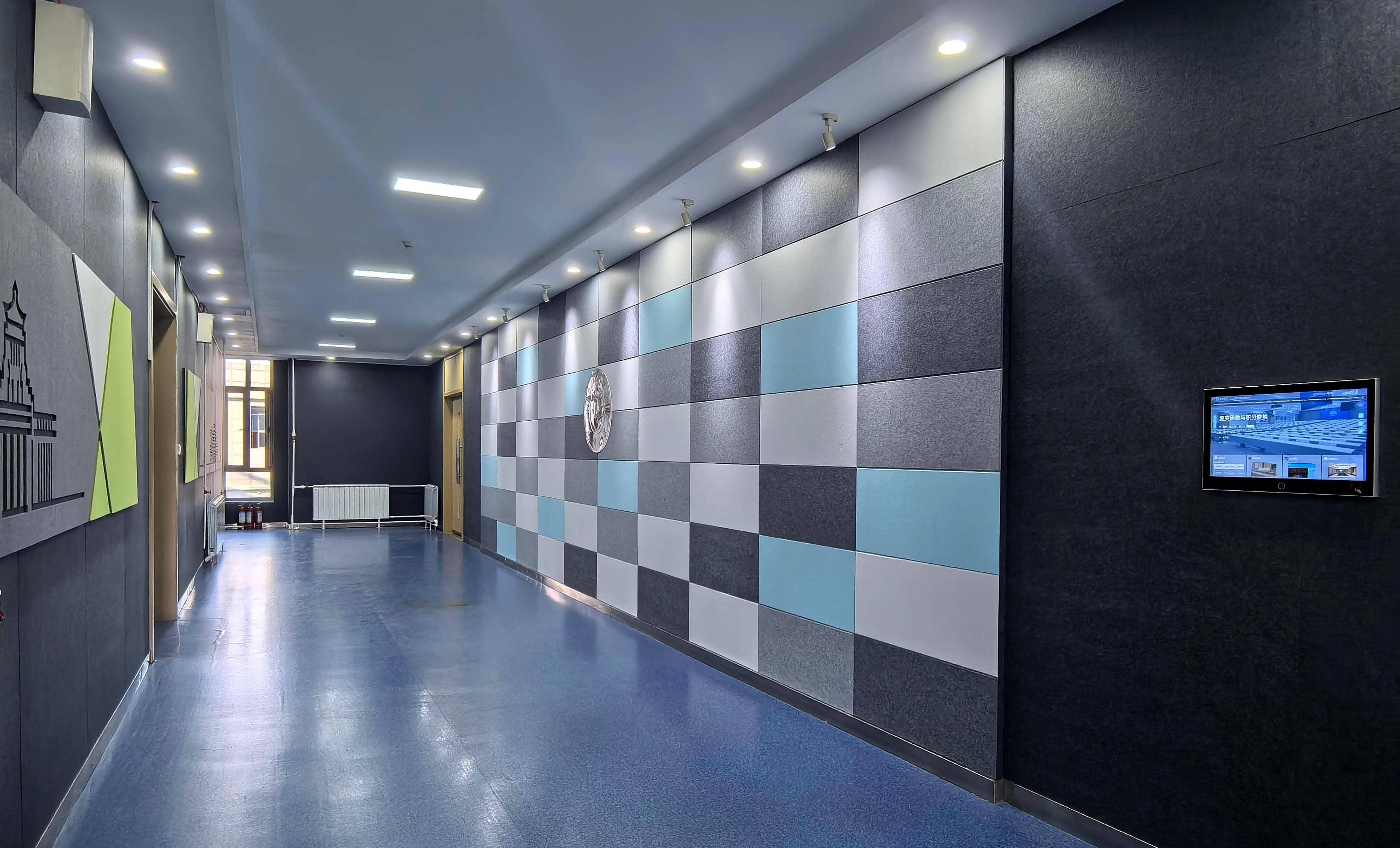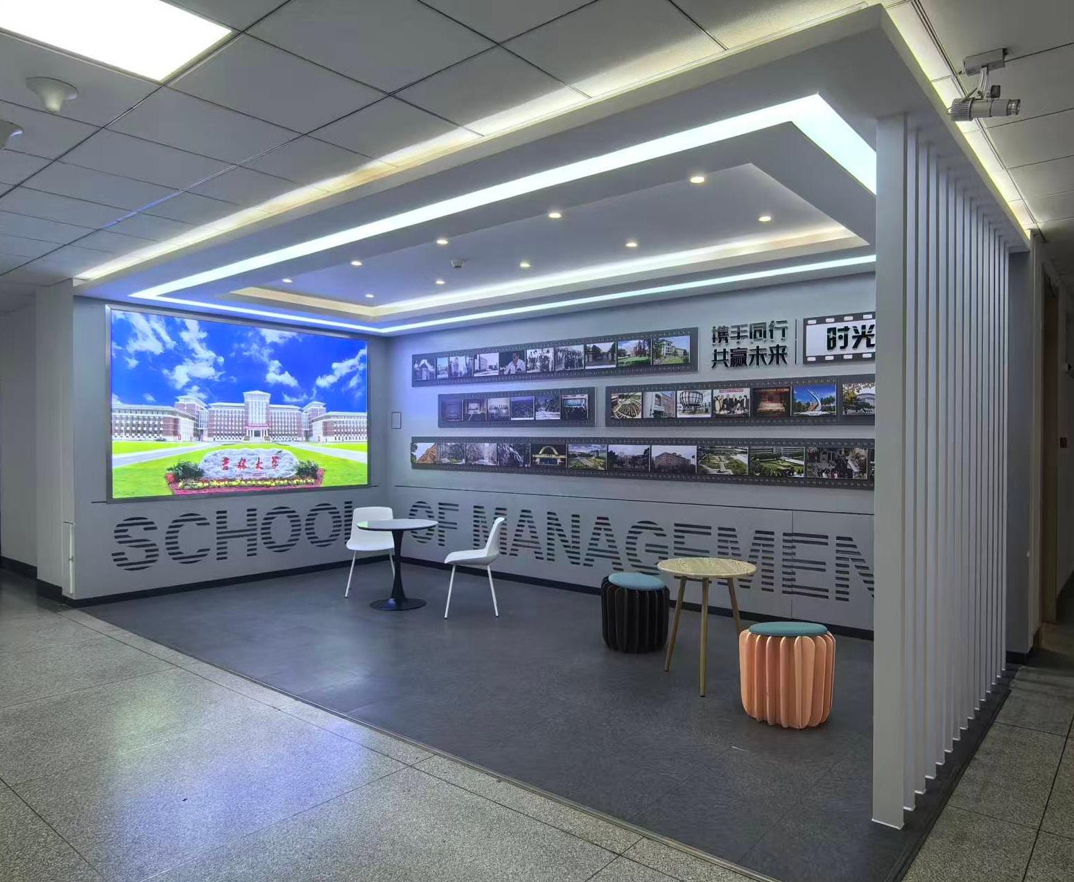 在本科生院及东区办公室的指导下,接到南岭校区逸夫教学楼走廊改造专项工作,设计系迅速组建由师生组成的实践教学团队,高效完成此次改造任务。经过前期多次现场勘察、开会讨论设计方案后,在72小时内完成包括:电梯间形象墙、走廊文化角、会议厅走廊空间三处改造项目的视觉设计方案。通过采用定制环保材料进行现场拼装的方式,既能保证艺术品质又能缩短工期。自9月19日起,实践教学团队与施工方开启“白+黑”工作模式。连续6昼夜完成近300平米墙面的艺术处理和多组装饰灯箱的安装调试。9月25日,南岭校区逸夫教学楼走廊文化建设改造项目全面竣工,焕然一新的走廊空间成为校园美育教学实践与学科精神传承的创新载体。